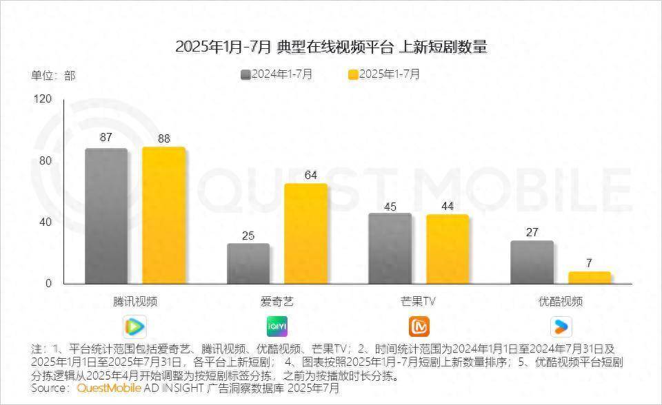 在线视频平台短剧赛道竞争更加激烈。1-7月份,腾信视频上线新短剧88部,爱奇艺64部,芒果TV44部,优酷7部,前两家平台均超过去年同期,芒果基本持平。
